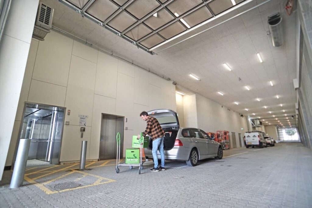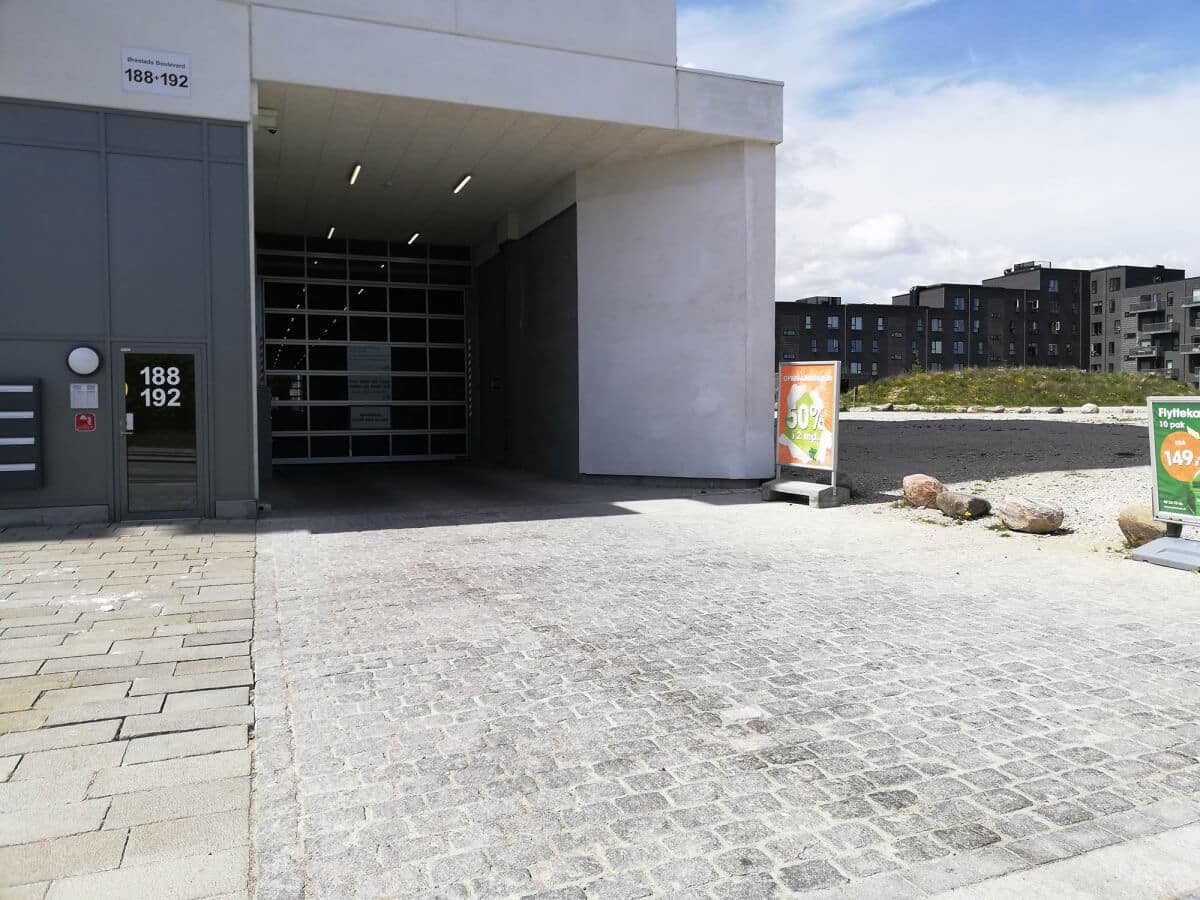 Her kan du nemt køre din bil, trailer eller flyttebil ind under vores aflæsnings- og pålæsningsområde i venstre side. Du er derved både tættere på indgangen, og kan læsse af i tørvejr.