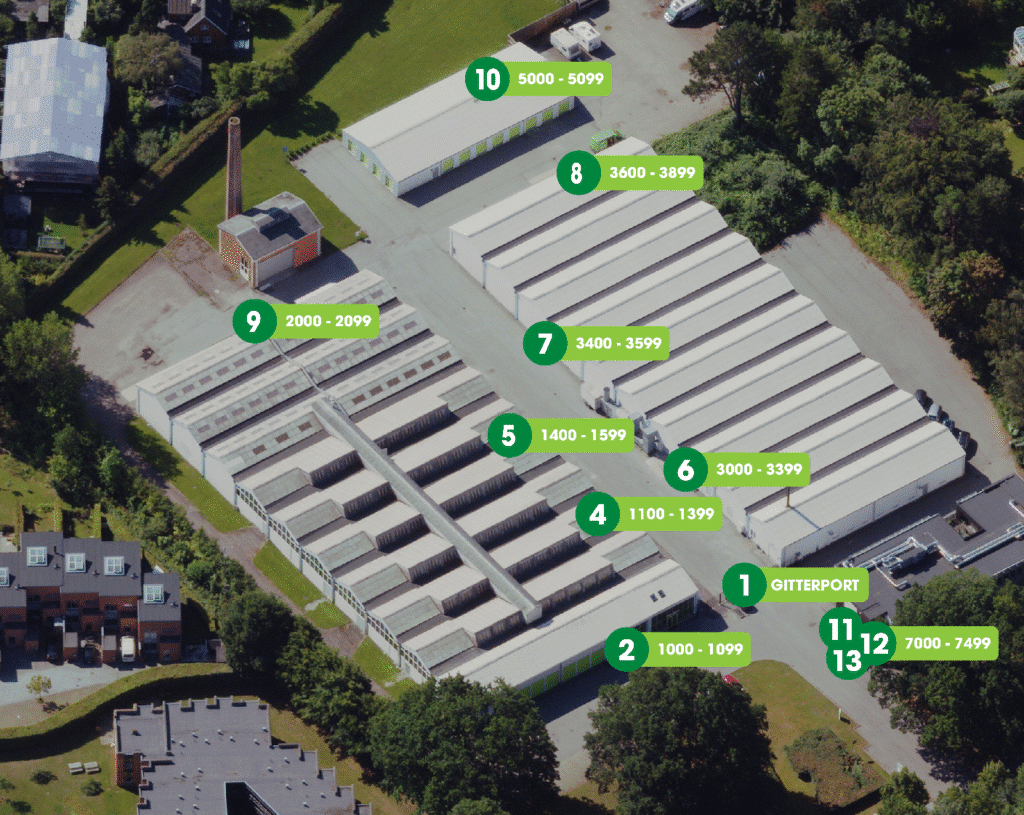 3xxx: Du har rum i bygningen til højre bag den sorte låge. Du skal bruge din kode ved den sorte skydelåge. Der er to døre på siden af bygningen og én i gavlen. På dørene er angivet i hvilken nummerserie du skal benytte.